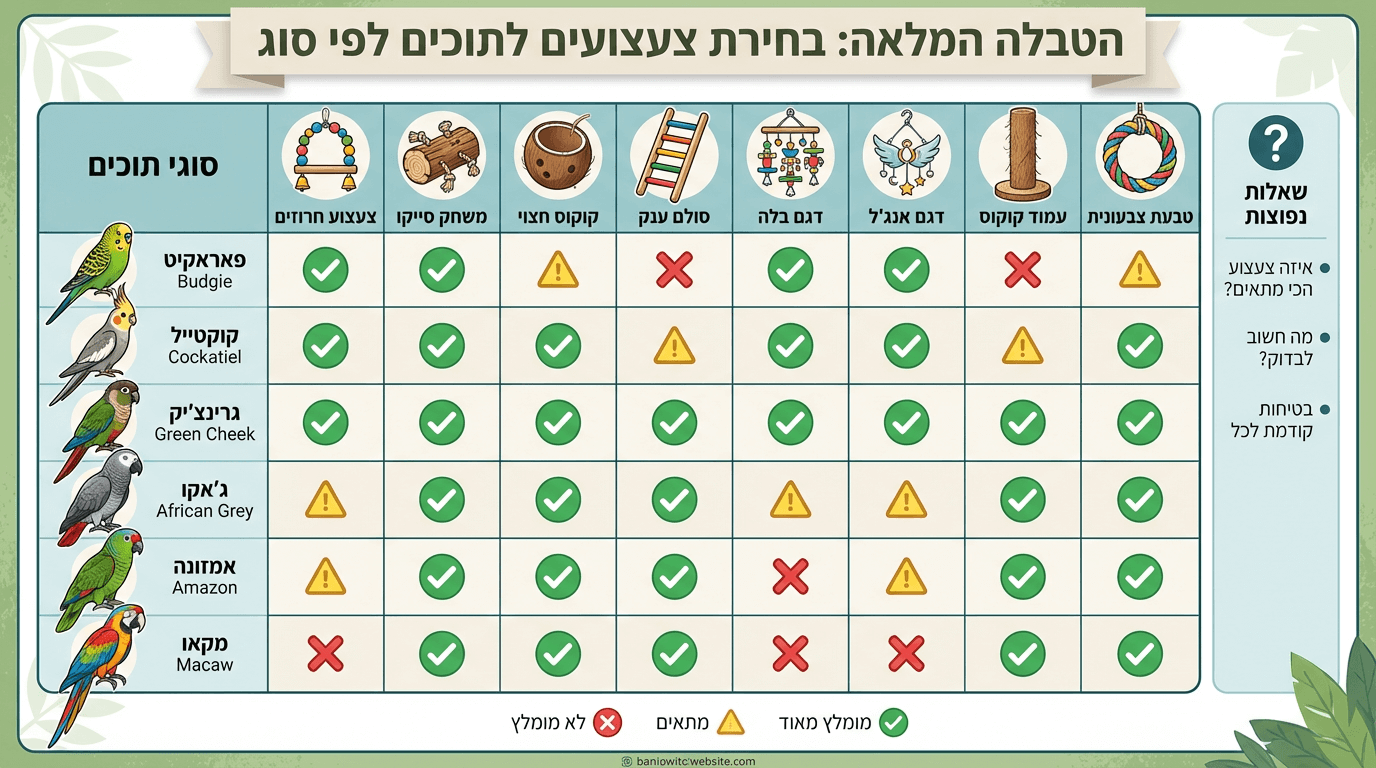 לפי אופי התוכי: תוכי אקטיבי= סולמות ונדנדות. תוכי שקט= משחקי חשיבה ולעיסה.